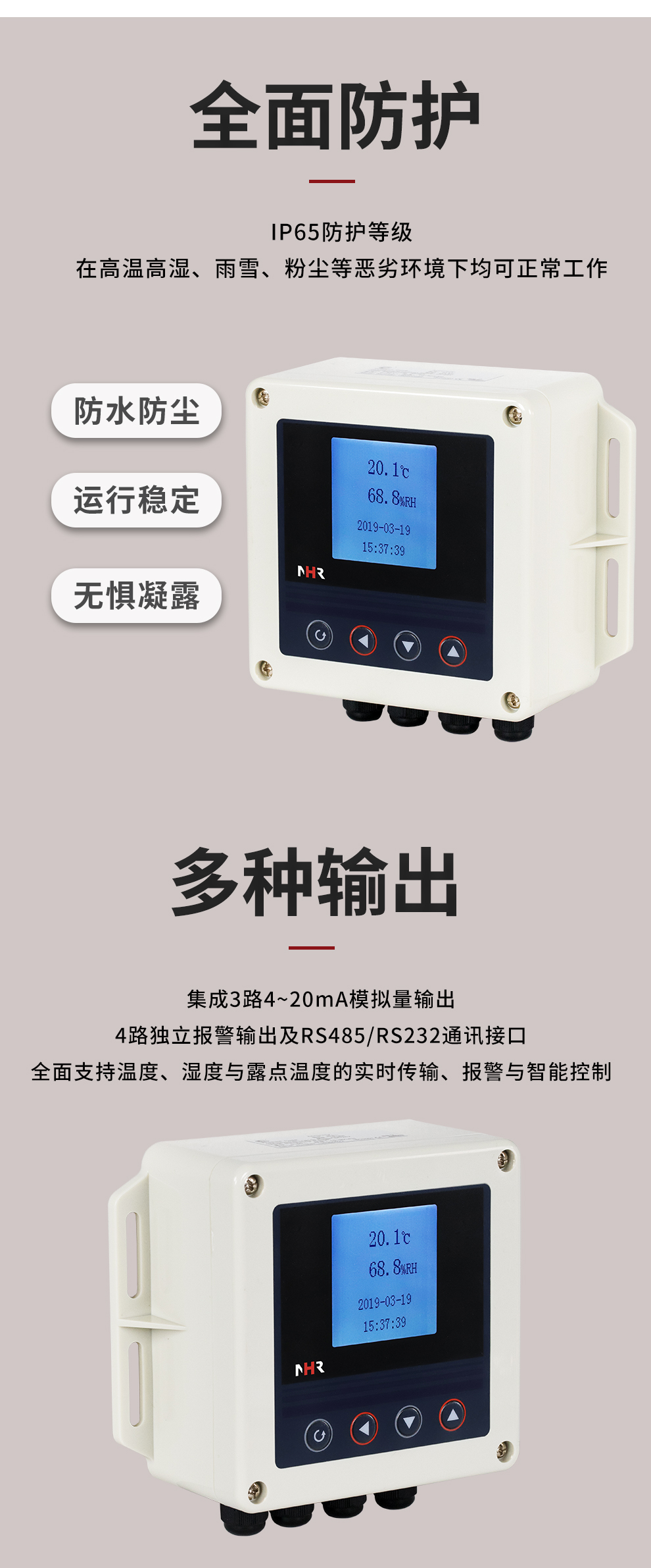 虹潤(rùn)公司是專業(yè)生產(chǎn)環(huán)境監(jiān)測(cè)儀表的國(guó)家專精特新“小巨人”企業(yè)。生產(chǎn)的壁掛式溫濕度控制器,具有溫度、濕度、露點(diǎn)高精準(zhǔn)的測(cè)量,多種輸出類型,穩(wěn)定性強(qiáng),RS485/RS232通訊,IP65防護(hù)等級(jí)等特點(diǎn)。產(chǎn)品獲得一種手持式低功耗溫濕度檢測(cè)儀、大屏幕溫濕度記錄儀等2項(xiàng)國(guó)家發(fā)明專利,主持起草物聯(lián)網(wǎng)智能溫度儀表通用技術(shù)條件、冷鏈溫度記錄儀等2項(xiàng)國(guó)家標(biāo)準(zhǔn),通信系統(tǒng)多通道數(shù)據(jù)采集控制終端規(guī)范軍用標(biāo)準(zhǔn),以及現(xiàn)場(chǎng)設(shè)備集成等5項(xiàng)智能制造國(guó)家標(biāo)準(zhǔn),參與國(guó)際5G標(biāo)準(zhǔn)制定,取得溫濕度儀表等2項(xiàng)相關(guān)軟件著作權(quán)。產(chǎn)品廣泛應(yīng)用于工業(yè)現(xiàn)場(chǎng)、農(nóng)業(yè)大棚、倉(cāng)儲(chǔ)物流、地下管廊、養(yǎng)殖孵化、配電機(jī)房等諸多領(lǐng)域。