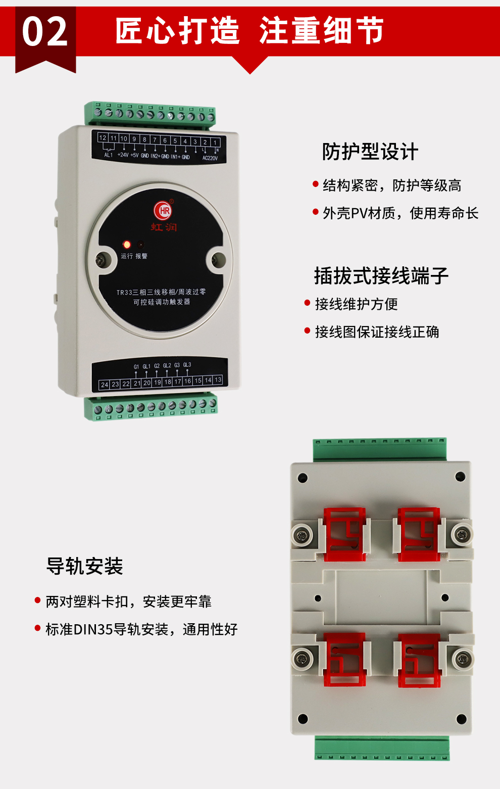 虹潤公司是專業(yè)生產(chǎn)移相觸發(fā)器的國家專精特新“小巨人”企業(yè),生產(chǎn)的移相觸發(fā)器,具有采用光電隔離設(shè)計,自動同步功能,過流保護技術(shù),電源缺相檢測,信號超限報警等特點。產(chǎn)品獲得巡回檢測顯示方法及裝置、儀表殼體等2項國家發(fā)明專利,主持起草工業(yè)過程控制系統(tǒng)用模擬輸入兩位或多位輸出儀表、物聯(lián)網(wǎng)智能溫度儀表通用技術(shù)條件等2項國家標(biāo)準(zhǔn)以及通信系統(tǒng)多通道數(shù)據(jù)采集控制終端規(guī)范軍用標(biāo)準(zhǔn),參與國際5G標(biāo)準(zhǔn)制定,取得外置移相觸發(fā)器等2項相關(guān)軟件著作權(quán)。產(chǎn)品廣泛應(yīng)用于工業(yè)溫控、電極控制、航天軍工、電爐溫控、食品醫(yī)藥等諸多領(lǐng)域。