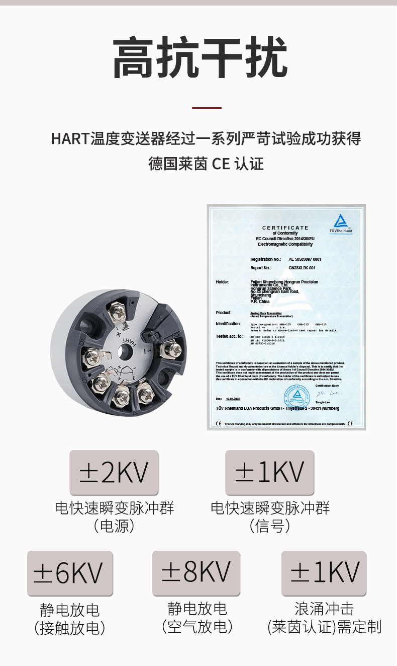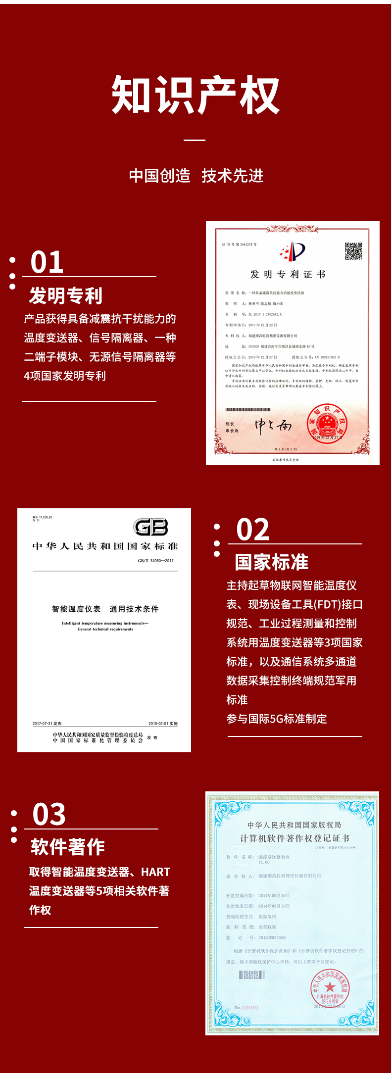 虹潤公司是專業(yè)生產(chǎn)溫度變送器的國家專精特新“小巨人”企業(yè)。生產(chǎn)的智能溫度變送器,具有適配各類溫度傳感器,精度高,穩(wěn)定性好,通過編程線修改輸入信號類型及量程,高抗干擾等特點。該產(chǎn)品不僅通過HART基金會認證、德國萊茵 CE 認證與 SIL 功能安全認證,還獲得具備減震抗干擾能力的溫度變送器、信號隔離器、一種二端子模塊、無源信號隔離器等4項國家發(fā)明專利,主持起草物聯(lián)網(wǎng)智能溫度儀表、現(xiàn)場設(shè)備工具(FDT)接口規(guī)范、工業(yè)過程測量和控制系統(tǒng)用溫度變送器等3項國家標(biāo)準,以及通信系統(tǒng)多通道數(shù)據(jù)采集控制終端規(guī)范軍用標(biāo)準,參與國際5G標(biāo)準制定,取得智能溫度變送器、HART溫度變送器等3項相關(guān)軟件著作權(quán)。產(chǎn)品廣泛應(yīng)用于石油、化工、電力、冶金、制藥、食品、水處理等各種工業(yè)領(lǐng)域。