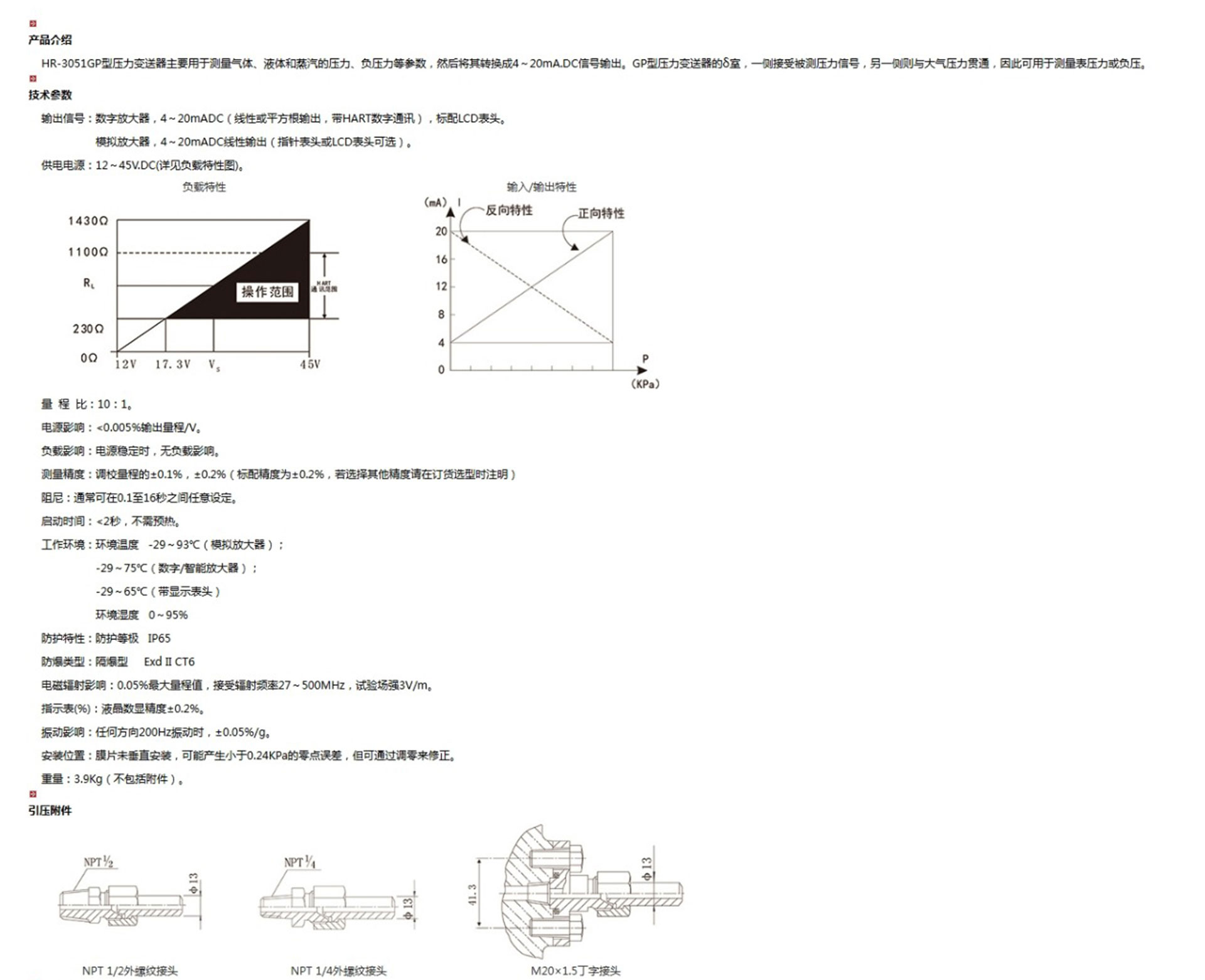 HR-3051GP型壓力變送器主要用于測量氣體、液體和蒸汽的壓力、負壓力等參數(shù),然后將其轉(zhuǎn)換成4~20mA.DC信號輸出。GP型壓力變送器的δ室,一側(cè)接受被測壓力信號,另一側(cè)則與大氣壓力貫通,因此可用于測量表壓力或負壓。