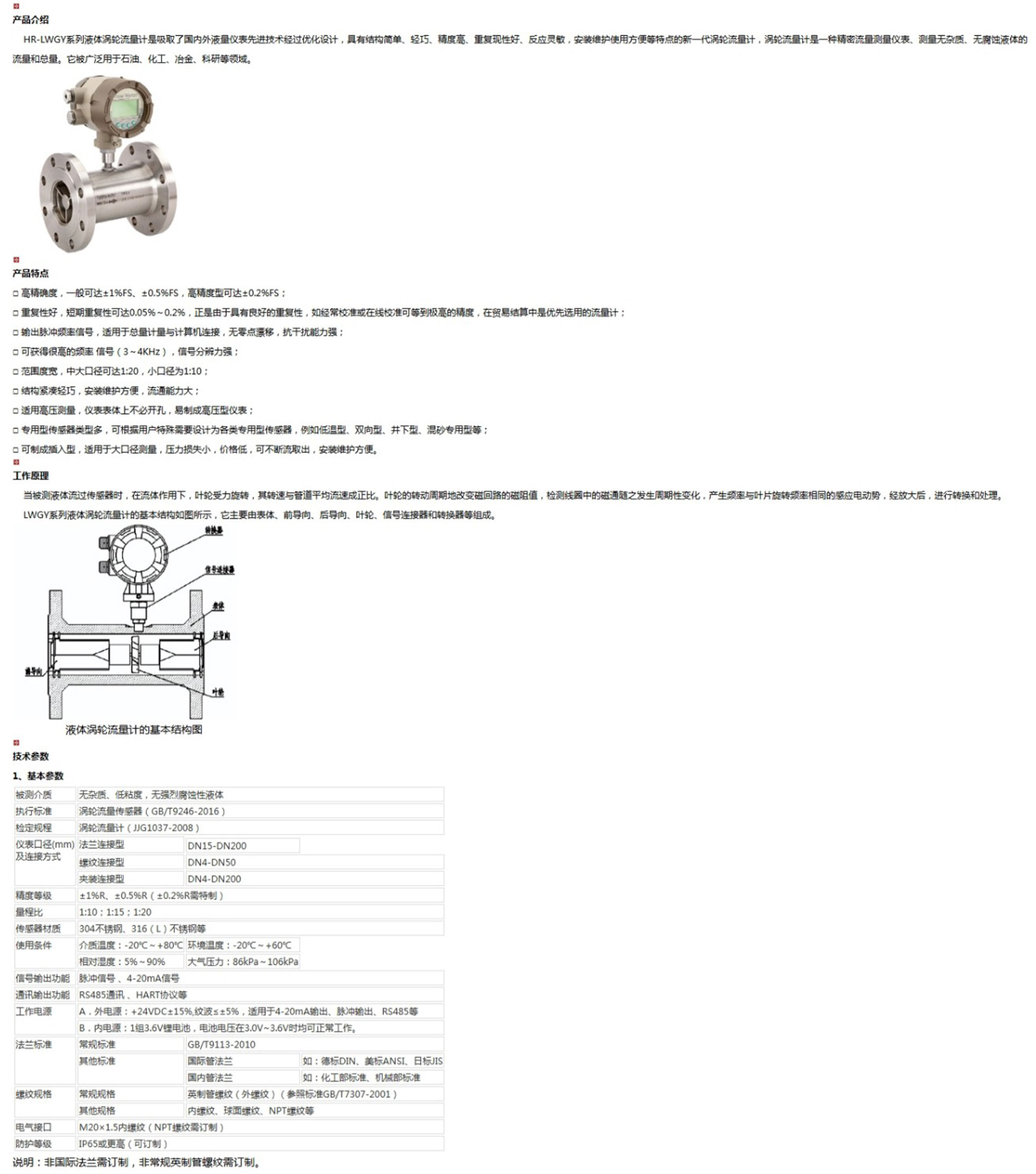 HR-LWGY系列液體渦輪流量計是吸取了國內(nèi)外液量儀表先進(jìn)技術(shù)經(jīng)過優(yōu)化設(shè)計,具有結(jié)構(gòu)簡單、輕巧、精度高、重復(fù)現(xiàn)性好、反應(yīng)靈敏,安裝維護(hù)使用方便等特點的新一代渦輪流量計,渦輪流量計是一種精密流量測量儀表、測量無雜質(zhì)、無腐蝕液體的流量和總量。它被廣泛用于石油、化工、冶金、科研等領(lǐng)域。